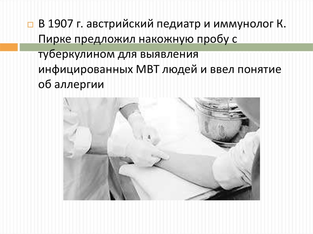 В 1907 г. австрийский педиатр и иммунолог К.Пирке предложил накожную пробу с