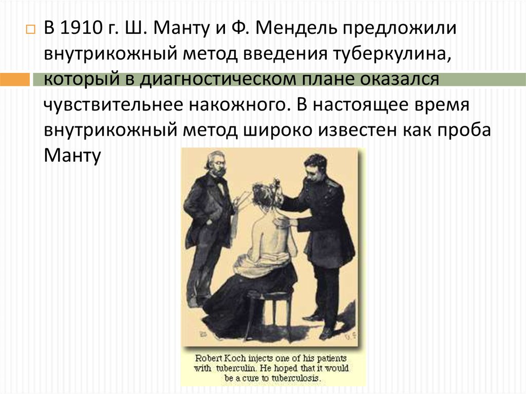 В 1910 г. Ш. Манту и Ф. Мендель предложиливнутрикожный метод введения туберкулина,
