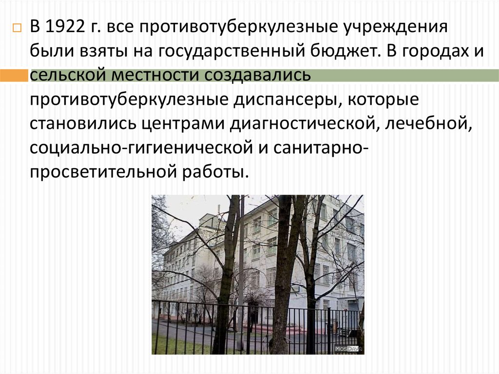 В 1922 г. все противотуберкулезные учреждениябыли взяты на государственный бюджет. В городах и