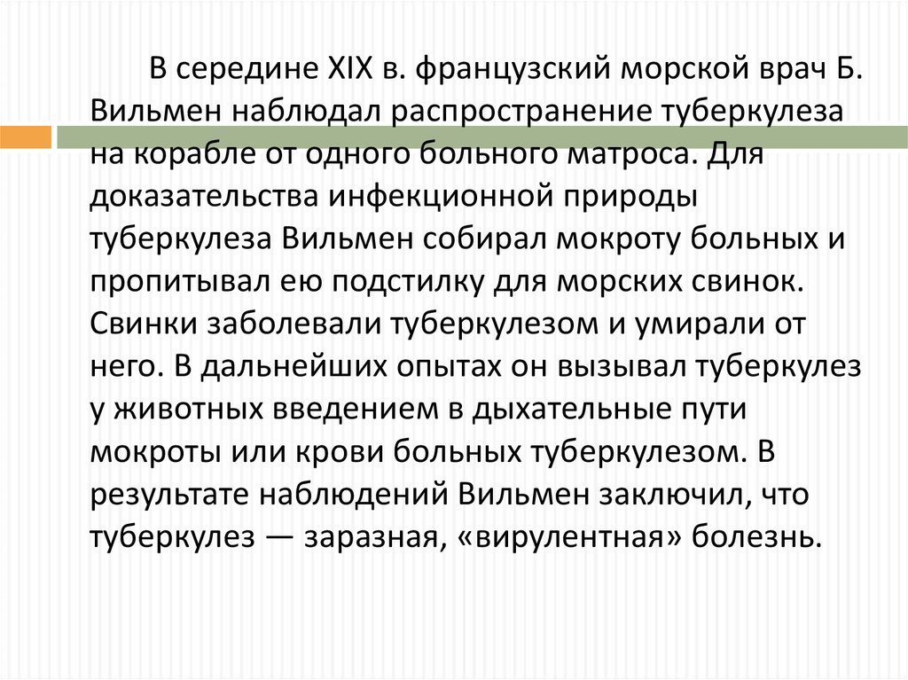 В середине XIX в. французский морской врач Б.Вильмен наблюдал распространение туберкулеза