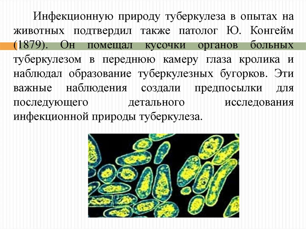 Инфекционную природу туберкулеза в опытах наживотных подтвердил также патолог Ю. Конгейм