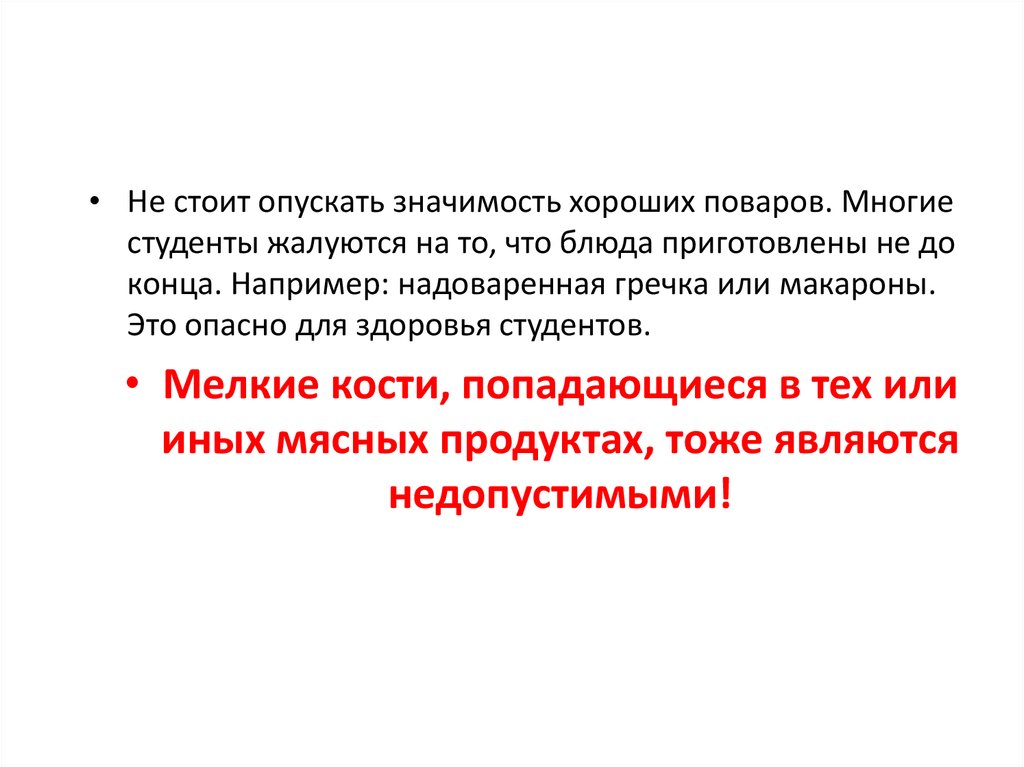 • Не стоит опускать значимость хороших поваров. Многиестуденты жалуются на то, что блюда приготовлены не до
