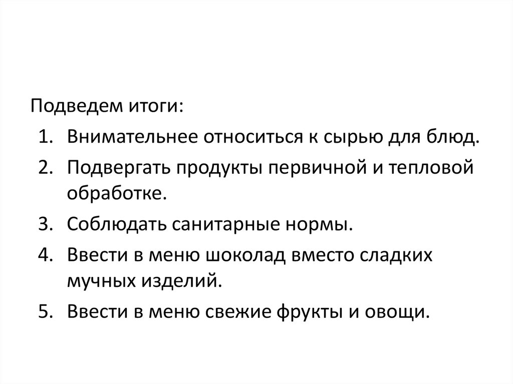 Подведем итоги:1. Внимательнее относиться к сырью для блюд.