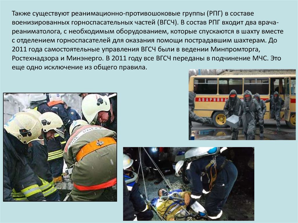 Также существуют реанимационно-противошоковые группы (РПГ) в составевоенизированных горноспасательных частей (ВГСЧ). В состав РПГ входит два врачареаниматолога, с необходимым оборудованием, которые спускаются в шахту вместе
