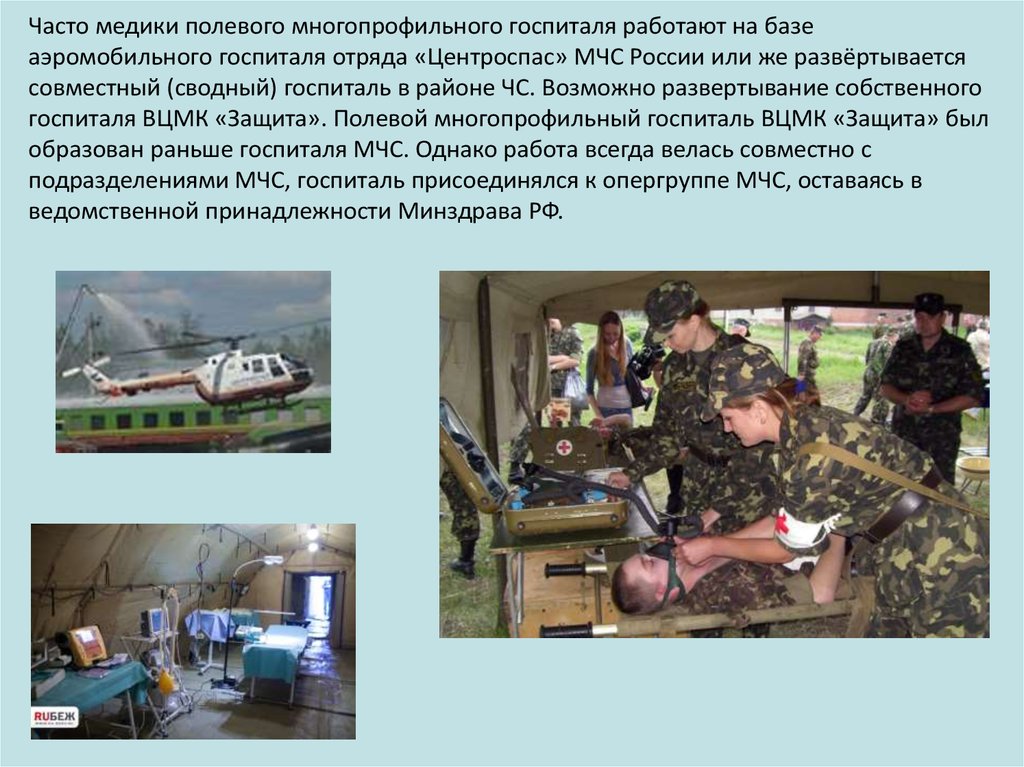 Часто медики полевого многопрофильного госпиталя работают на базеаэромобильного госпиталя отряда «Центроспас» МЧС России или же развёртывается