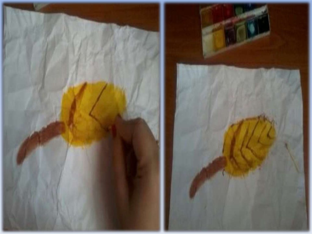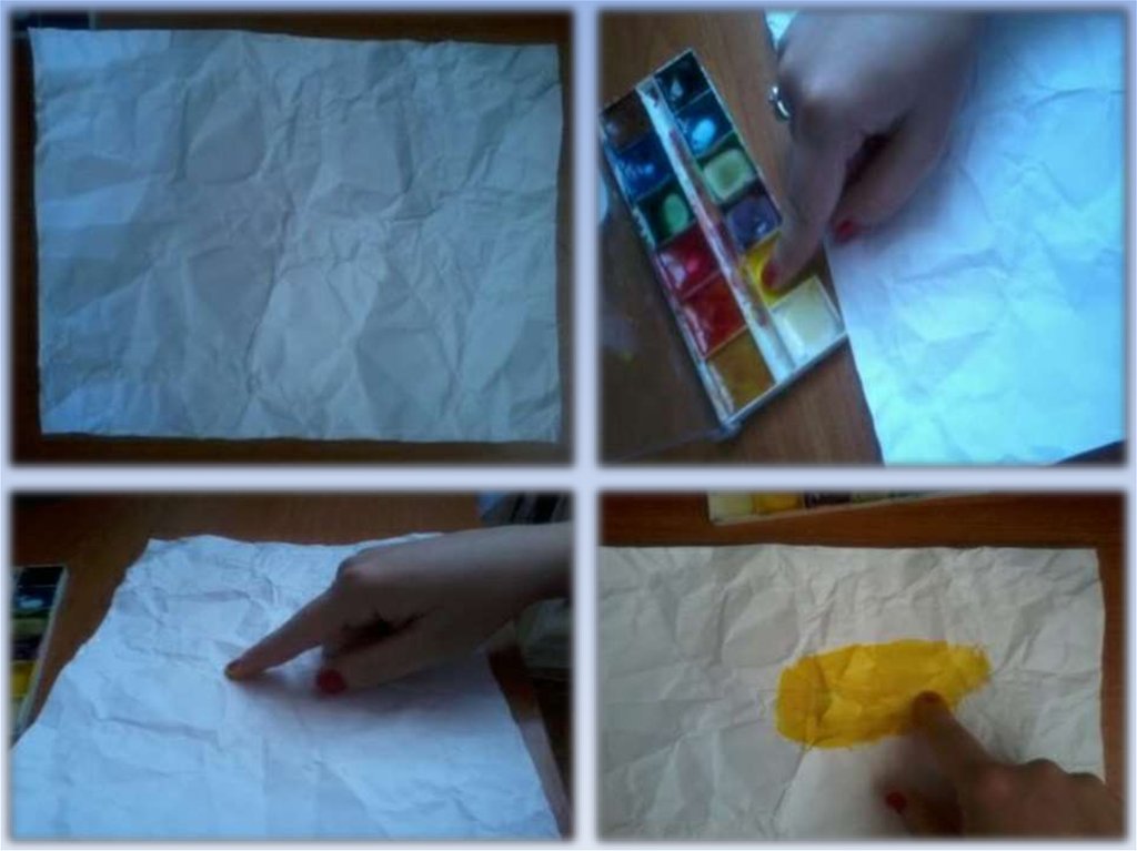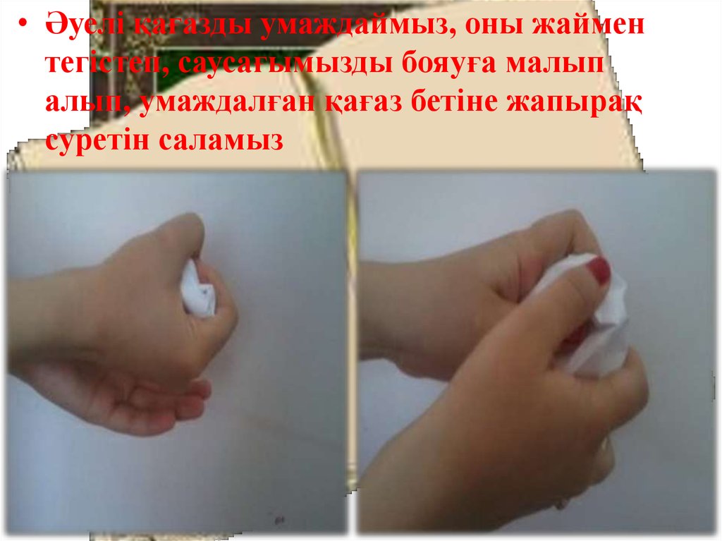 • Әуелі қағазды умаждаймыз, оны жайментегістеп, саусағымызды бояуға малып