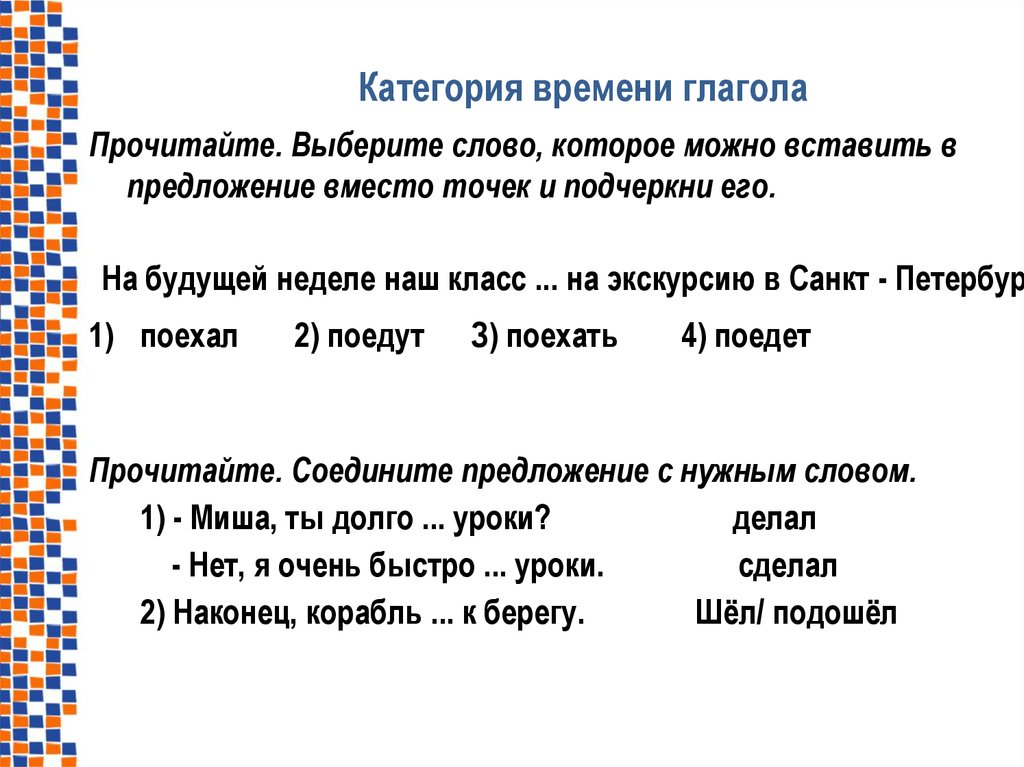 Категория времени глаголаПрочитайте. Выберите слово, которое можно вставить в