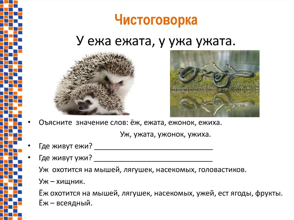 ЧистоговоркаУ ежа ежата, у ужа ужата.