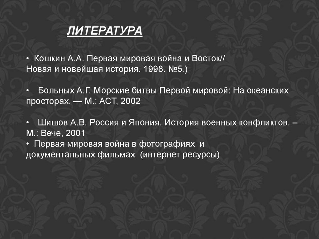 ЛИТЕРАТУРА• Кошкин А.А. Первая мировая война и Восток//