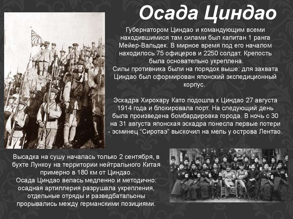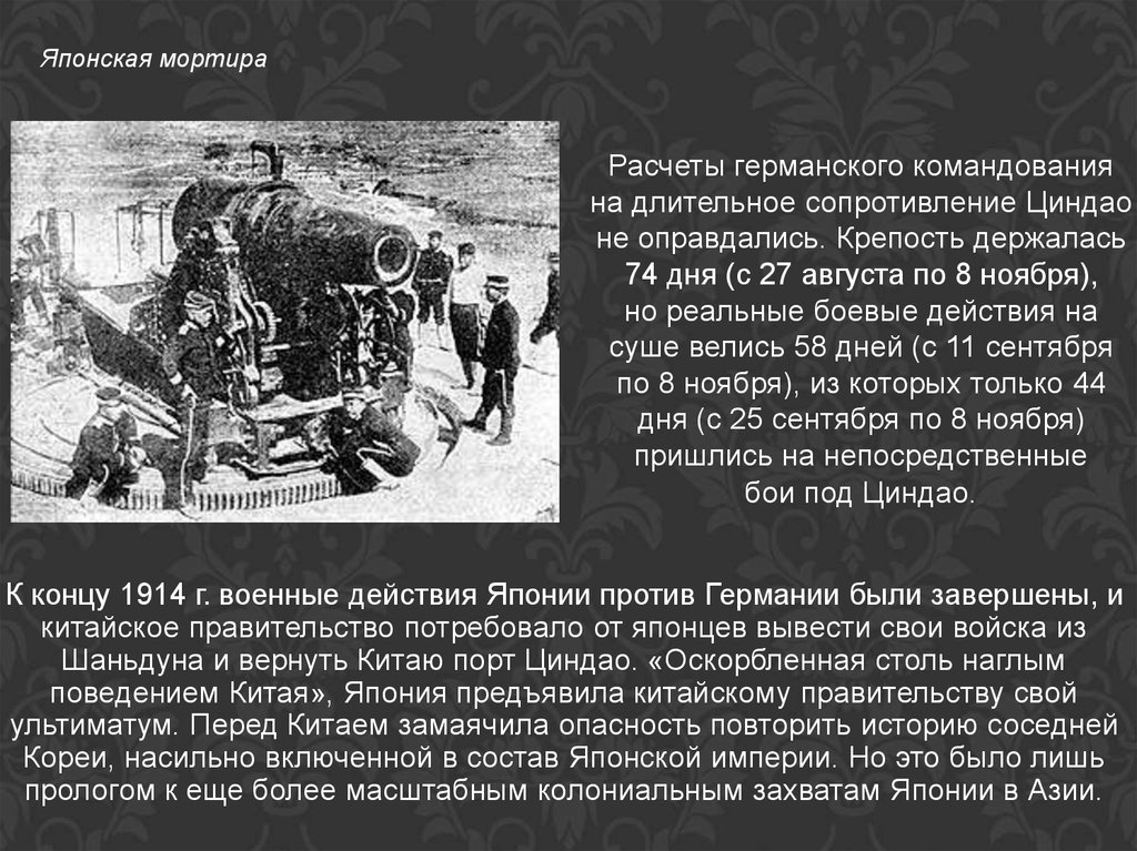 8 августа японские военные корабли появились в китайских водахблиз Шаньдуна.15 августа 1914 г. Япония послала германскому