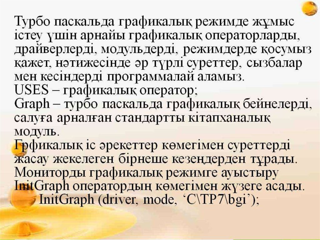 • Uses — арнайы графикалы оператор; қ Graph — ТурбоПаскальда графикалы қ бейнелерді салу а арнал ан
