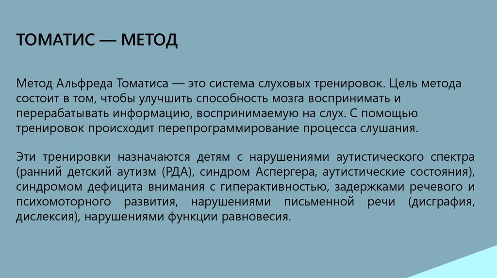 ТОМАТИС — МЕТОДМетод Альфреда Томатиса — это система слуховых тренировок. Цель метода