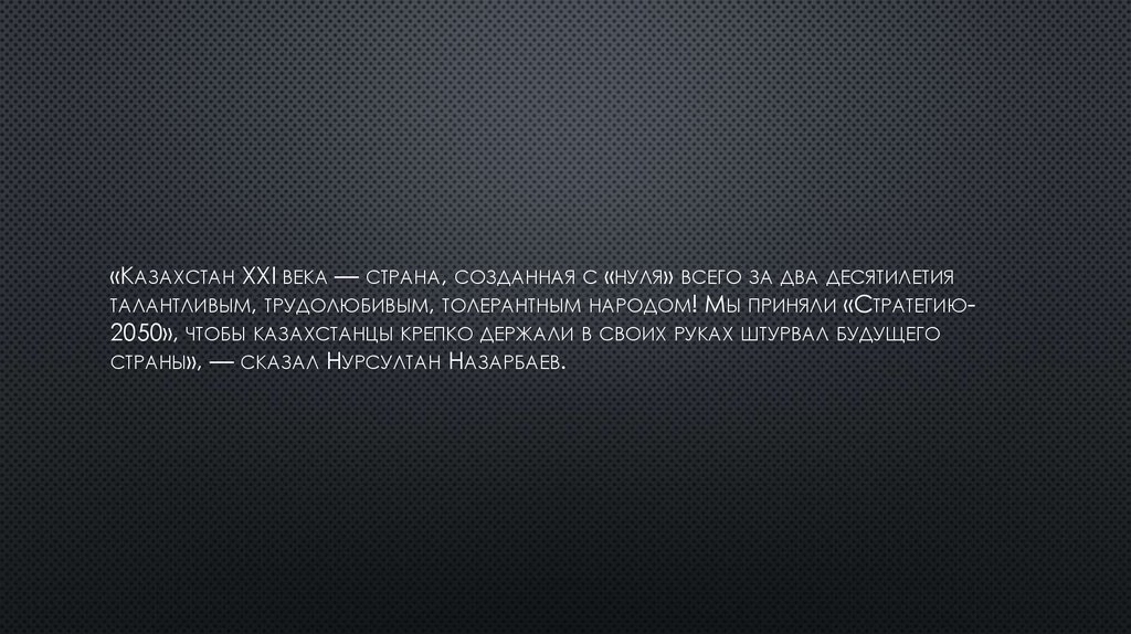 «КАЗАХСТАН ХХI ВЕКА — СТРАНА, СОЗДАННАЯ С «НУЛЯ» ВСЕГО ЗА ДВА ДЕСЯТИЛЕТИЯТАЛАНТЛИВЫМ, ТРУДОЛЮБИВЫМ, ТОЛЕРАНТНЫМ НАРОДОМ! МЫ ПРИНЯЛИ «СТРАТЕГИЮ2050», ЧТОБЫ КАЗАХСТАНЦЫ КРЕПКО ДЕРЖАЛИ В СВОИХ РУКАХ ШТУРВАЛ БУДУЩЕГО