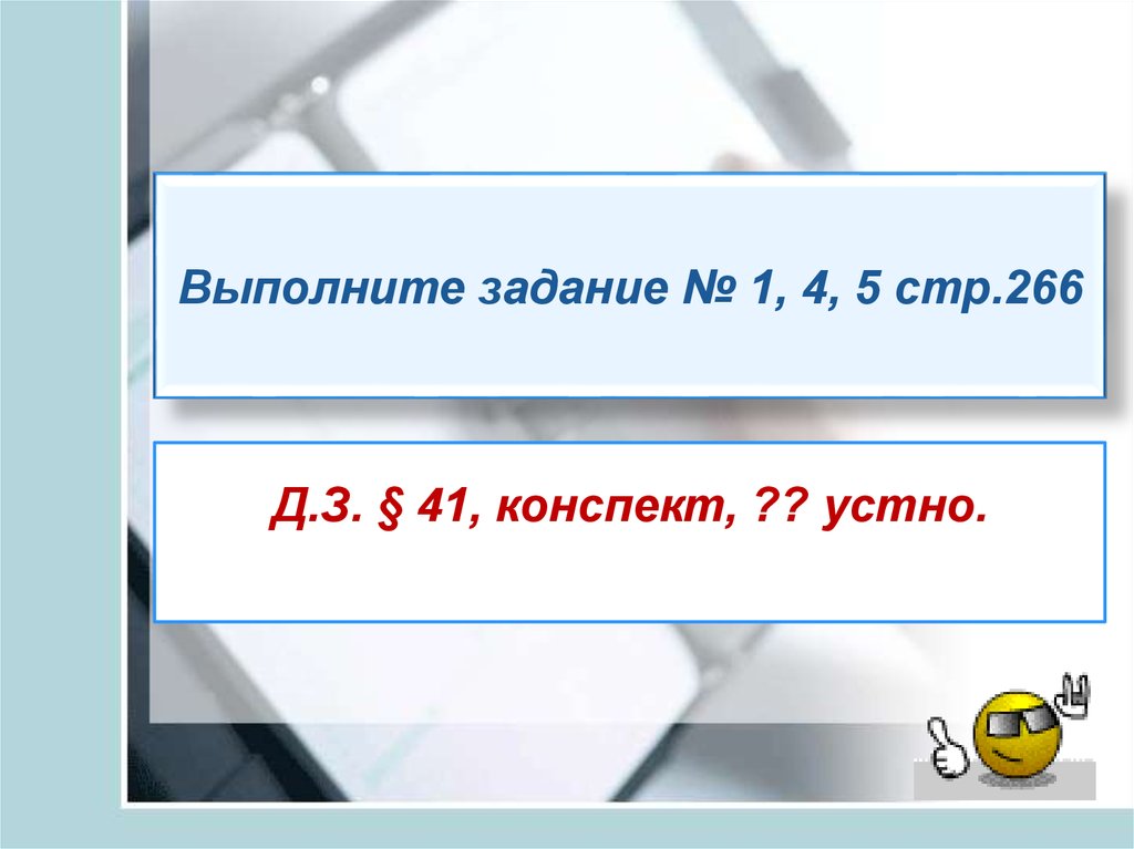 Выполните задание № 1, 4, 5 стр.266Д.З. § 41, конспект, ?? устно.