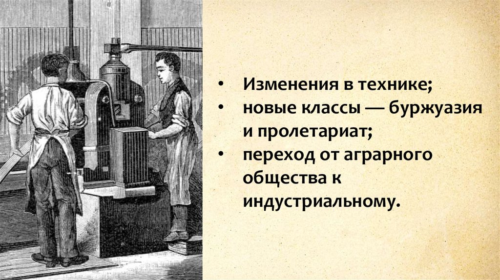 • Изменения в технике;• новые классы — буржуазия