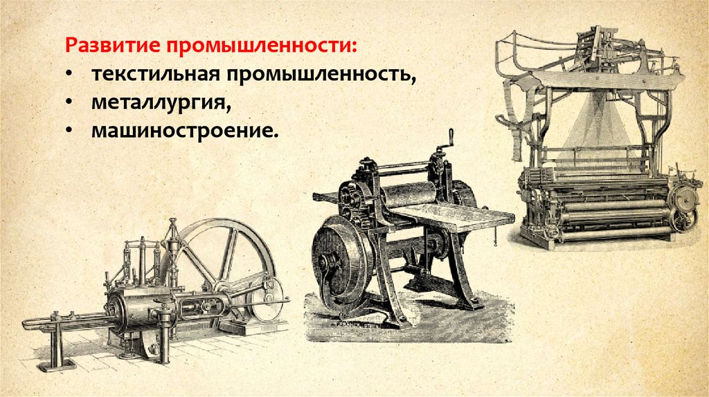 Развитие промышленности:• текстильная промышленность,