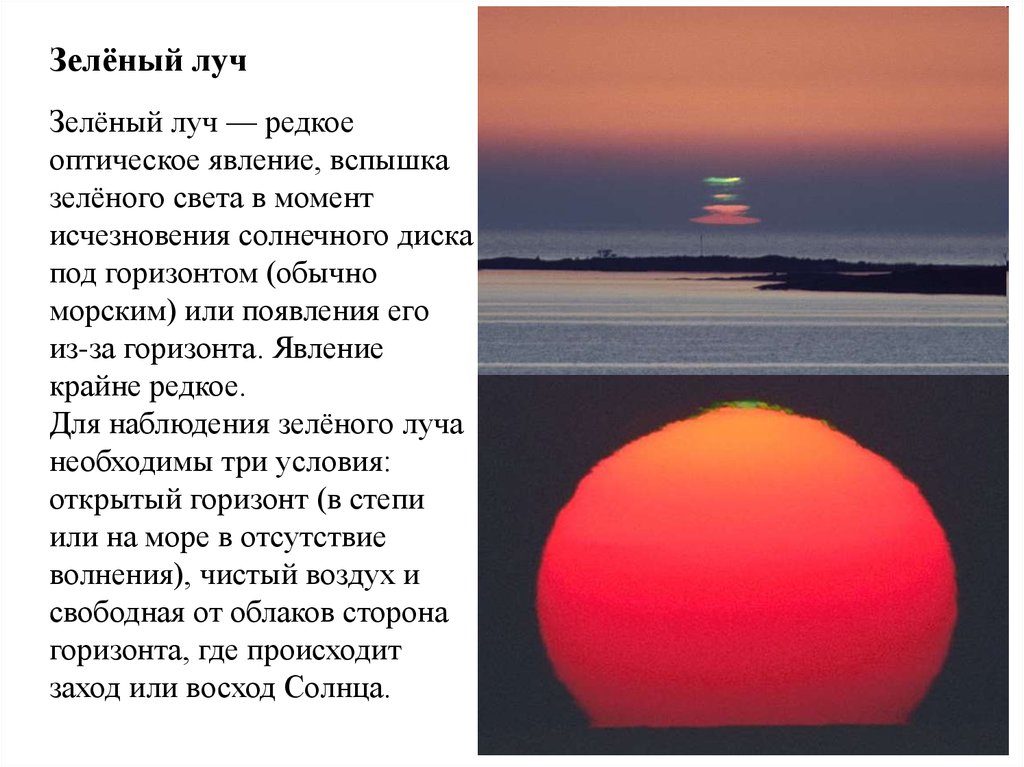 Явление зелёного луча бывает трёх форм:* в виде зелёного края верхней части диска Солнца,