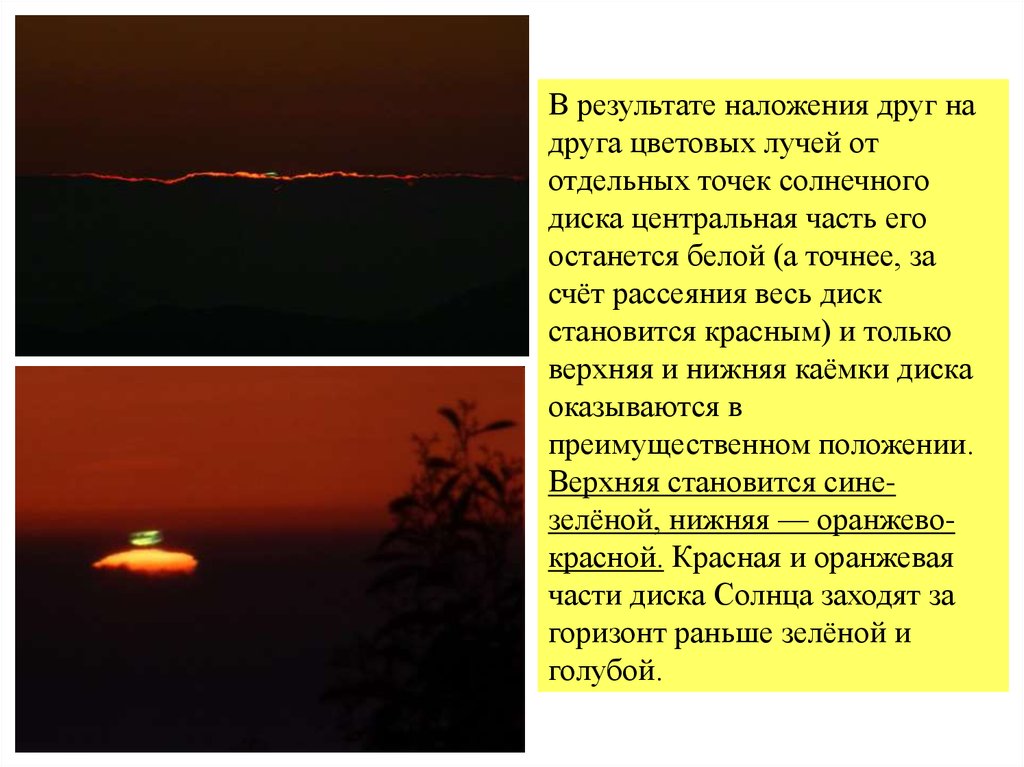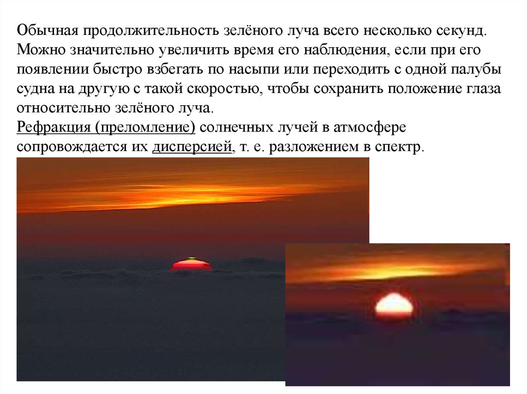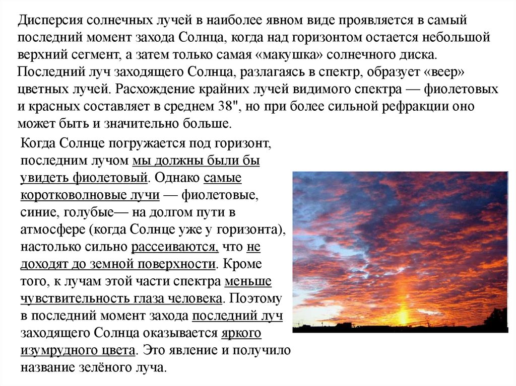 Дисперсия солнечных лучей в наиболее явном виде проявляется в самыйпоследний момент захода Солнца, когда над горизонтом остается небольшой
