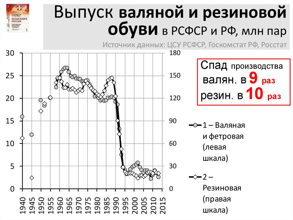 Выпуск валяной и резиновойобуви в РСФСР и РФ, млн пар