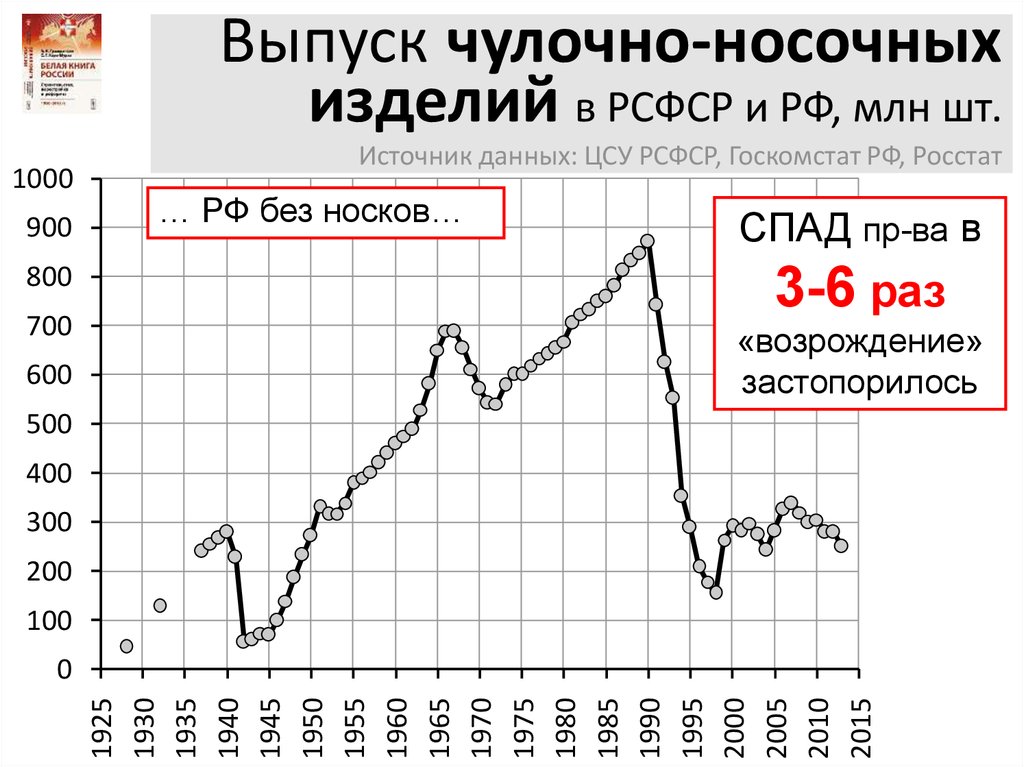 Выпуск чулочно-носочныхизделий в РСФСР и РФ, млн шт.