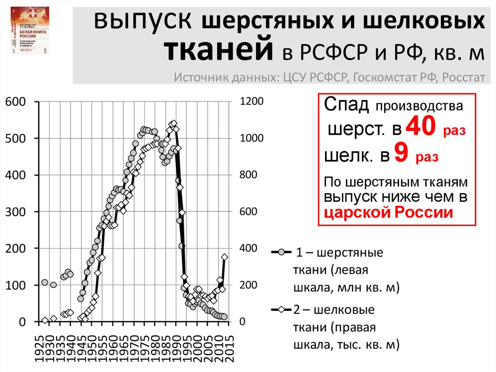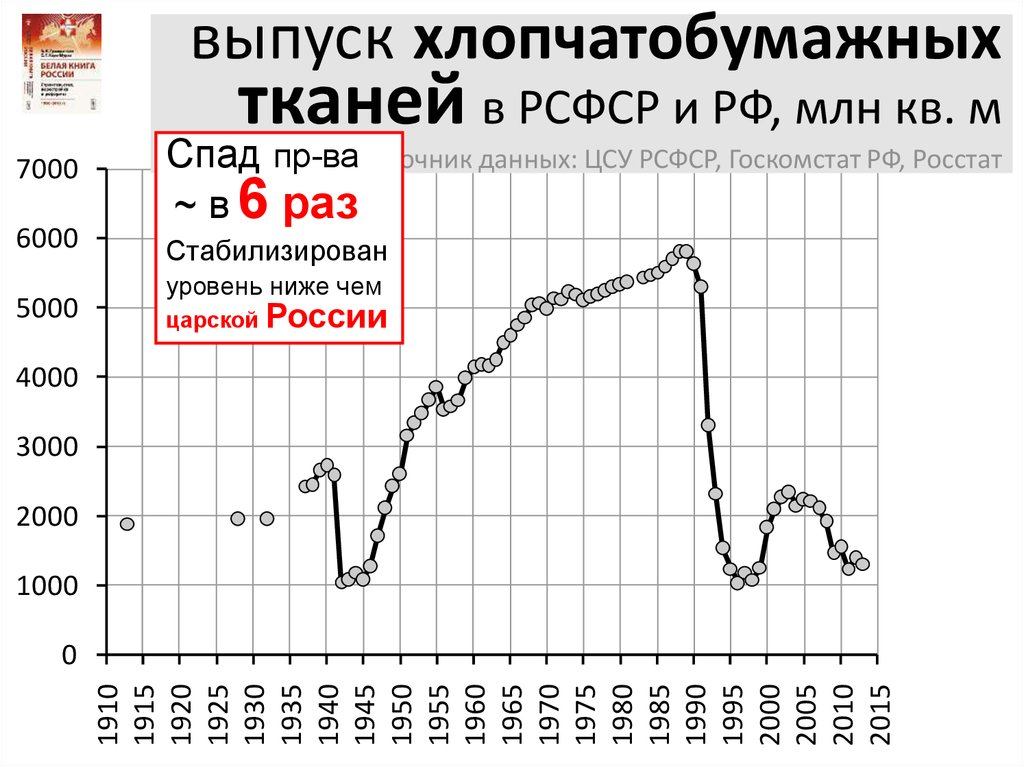 выпуск хлопчатобумажныхтканей в РСФСР и РФ, млн кв. м