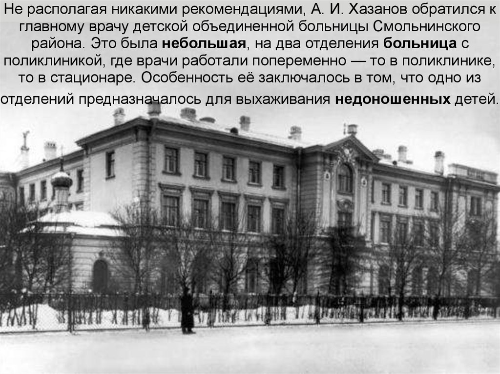 Не располагая никакими рекомендациями, А. И. Хазанов обратился кглавному врачу детской объединенной больницы Смольнинского