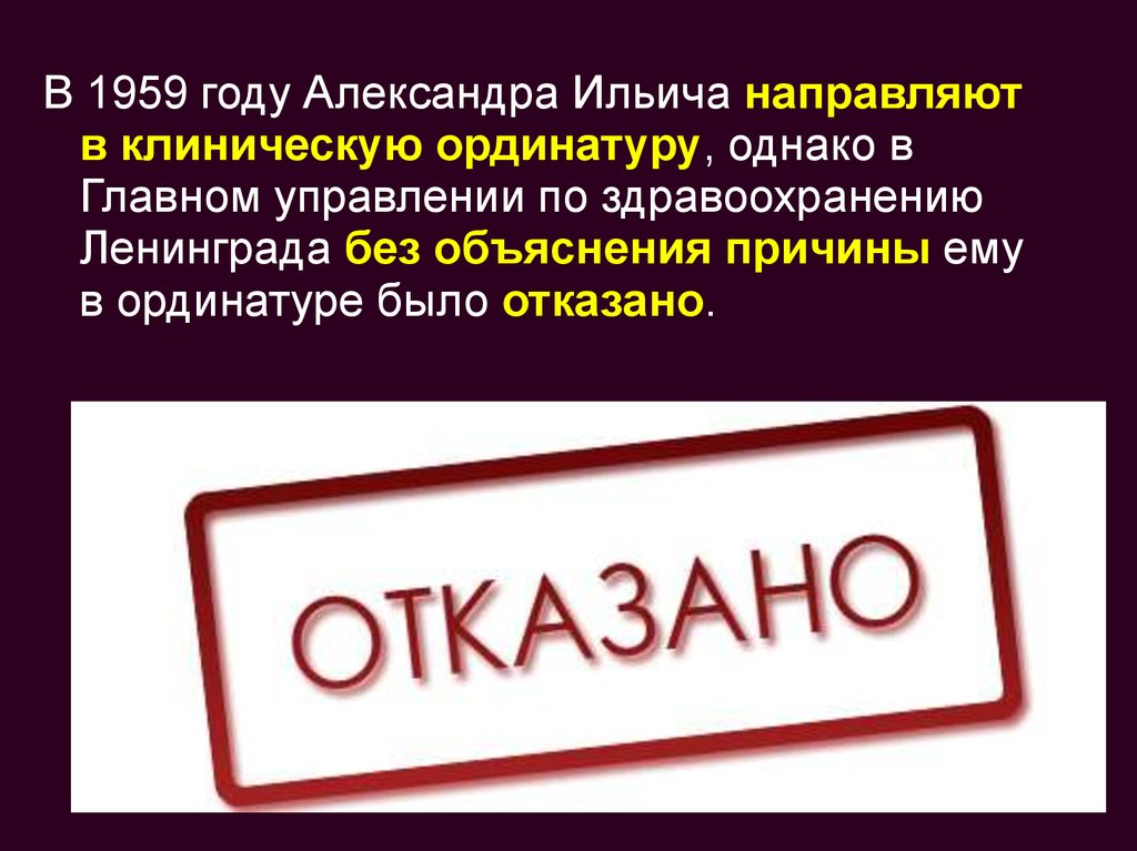 В 1959 году Александра Ильича направляютв клиническую ординатуру, однако в