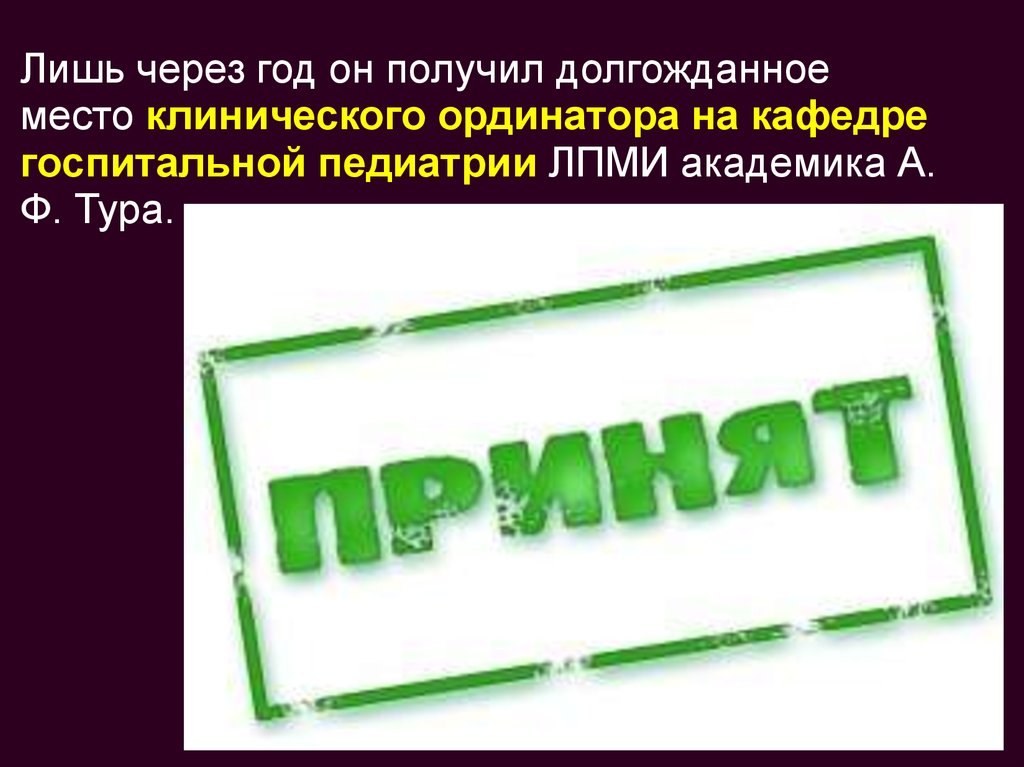 Лишь через год он получил долгожданноеместо клинического ординатора на кафедре