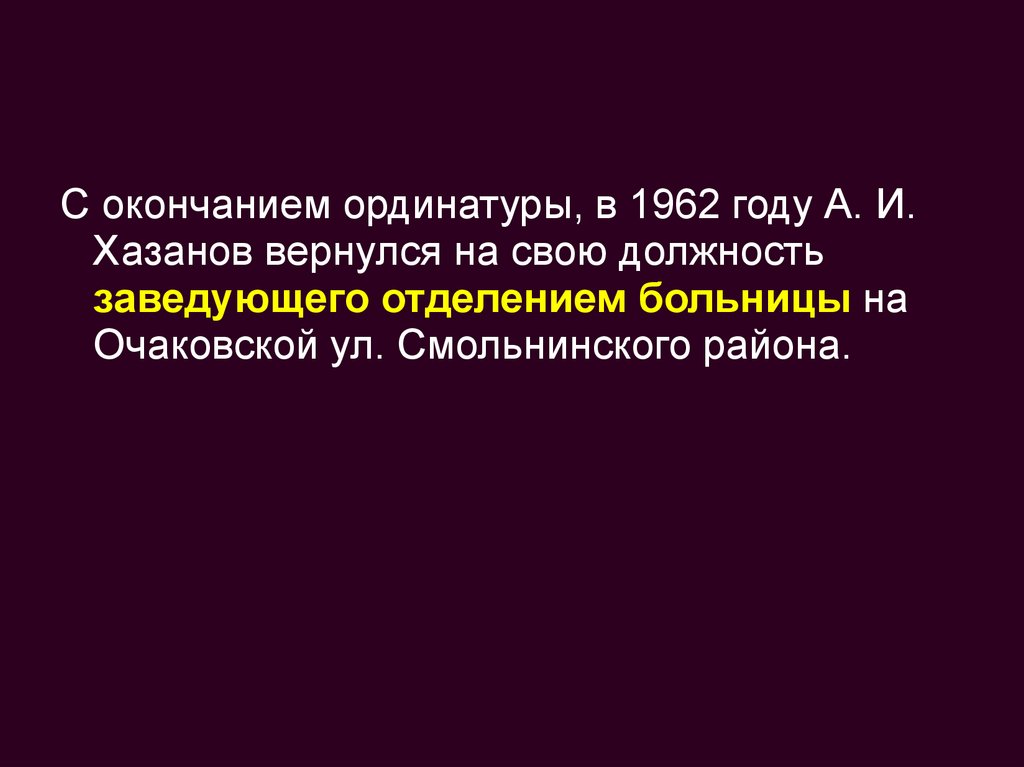 С окончанием ординатуры, в 1962 году А. И.Хазанов вернулся на свою должность