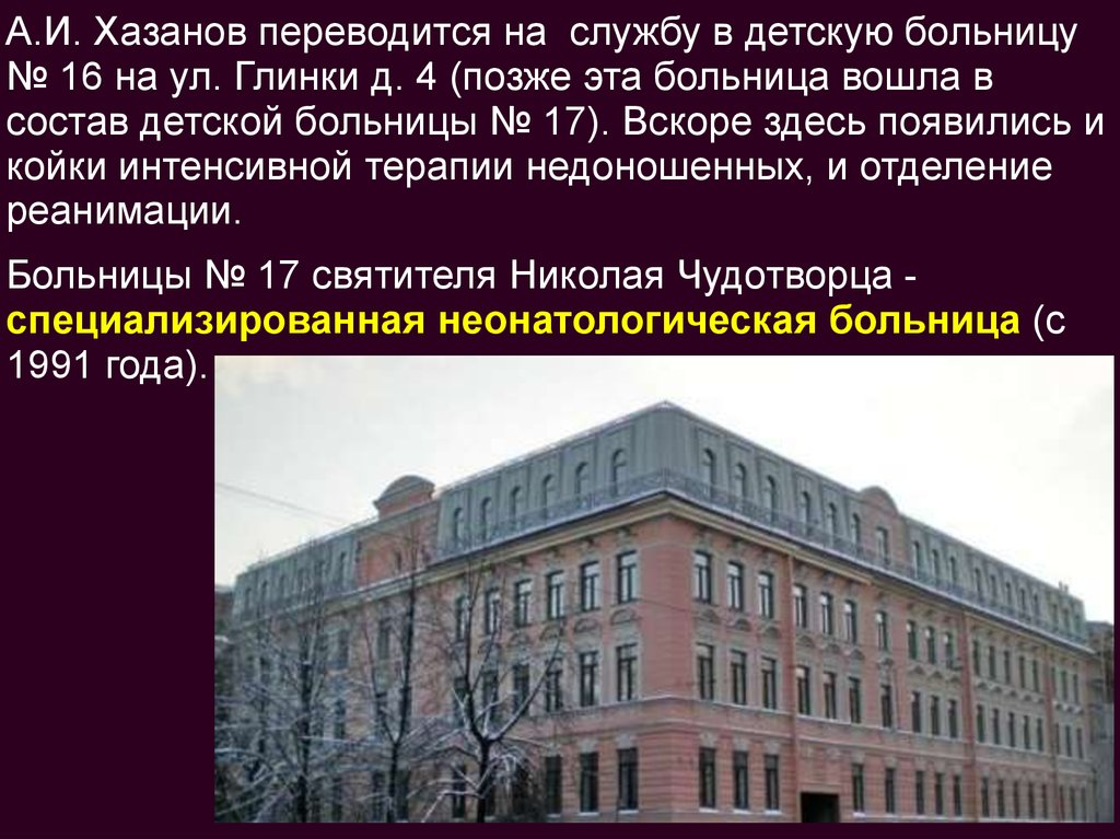 А.И. Хазанов переводится на службу в детскую больницу№ 16 на ул. Глинки д. 4 (позже эта больница вошла в