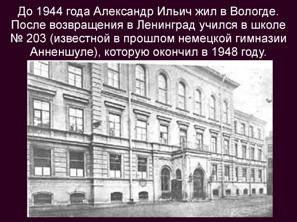 До 1944 года Александр Ильич жил в Вологде.После возвращения в Ленинград учился в школе