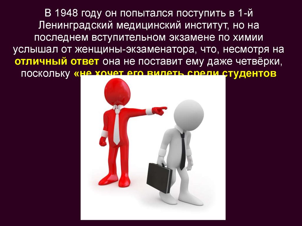 В 1948 году он попытался поступить в 1-йЛенинградский медицинский институт, но на