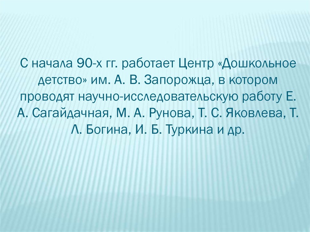 С начала 90-х гг. работает Центр «Дошкольноедетство» им. А. В. Запорожца, в котором