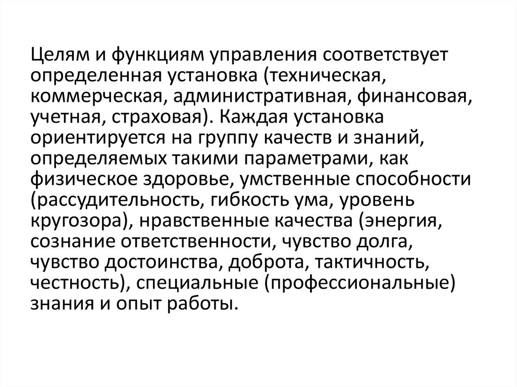 Целям и функциям управления соответствуетопределенная установка (техническая,