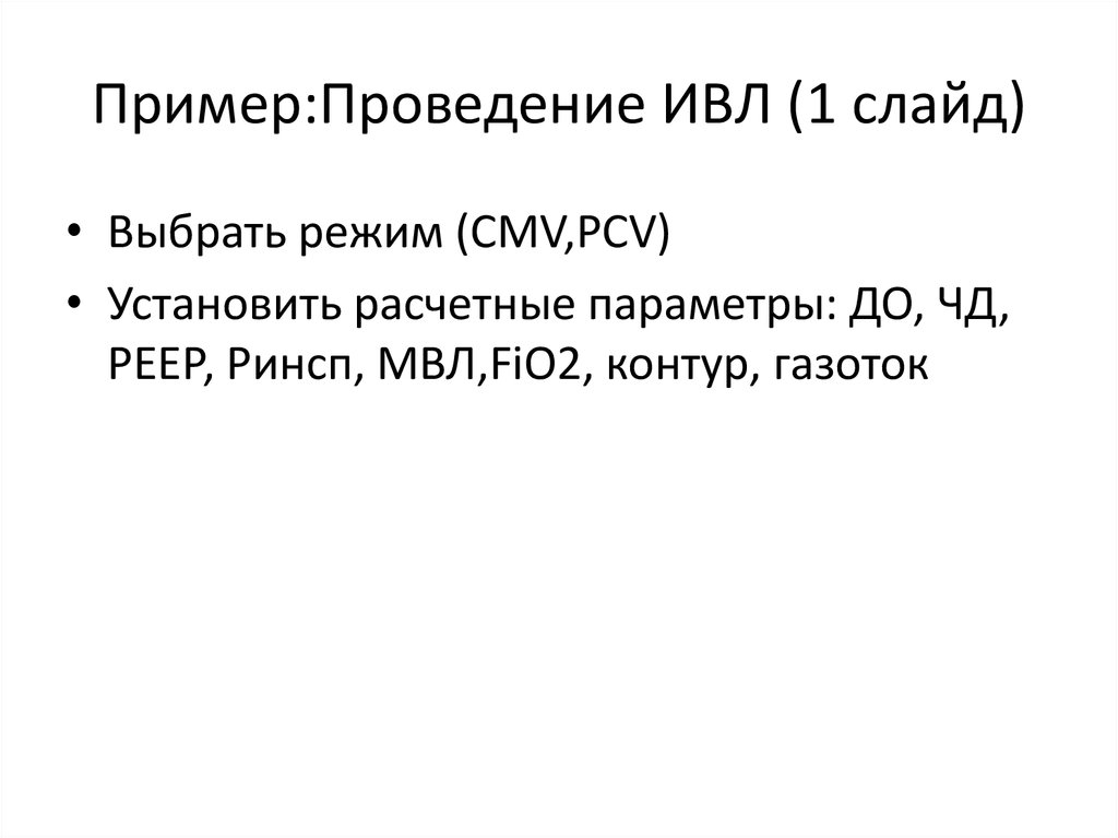 Пример:Проведение ИВЛ (1 слайд)• Выбрать режим (CMV,PCV)