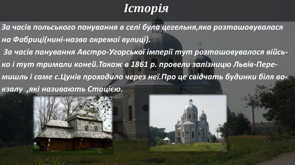 За часів панування Австро-Угорської імперії тут розташовувалося військо і тут тримали коней.Також в 1861 р. провели залізницю Львів-Перемишль і саме с.Цунів проходило через неї.Про це свідчать будинки біля вокзалу ,які називають Стацією.