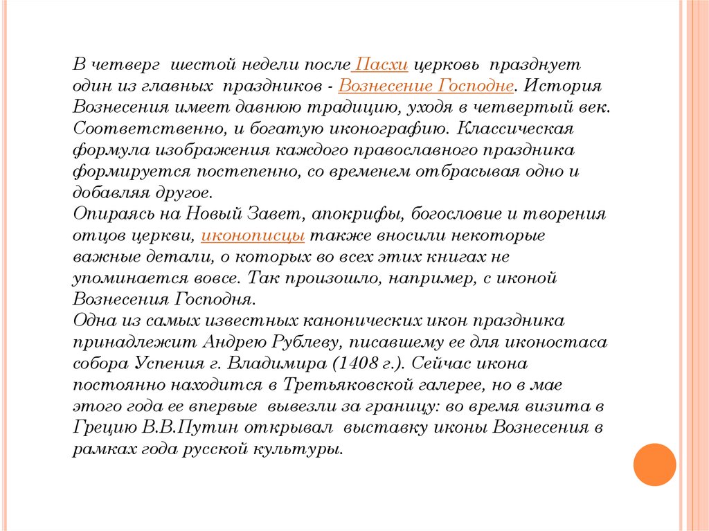В четверг шестой недели после Пасхи церковь празднуетодин из главных праздников - Вознесение Господне. История