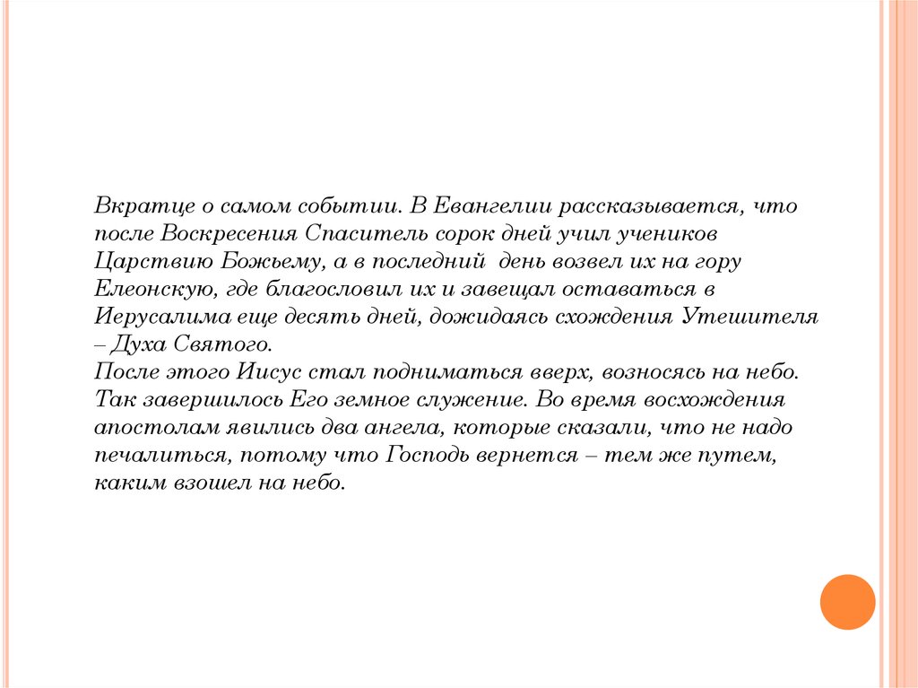 Вкратце о самом событии. В Евангелии рассказывается, чтопосле Воскресения Спаситель сорок дней учил учеников