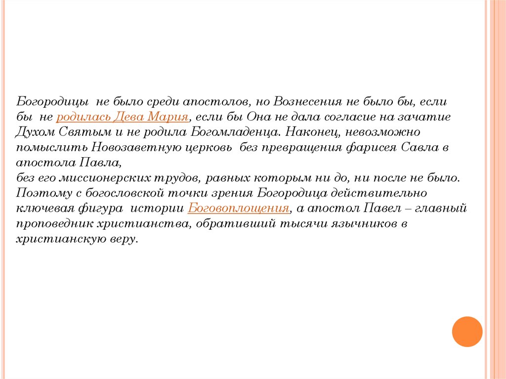 Богородицы не было среди апостолов, но Вознесения не было бы, еслибы не родилась Дева Мария, если бы Она не дала согласие на зачатие