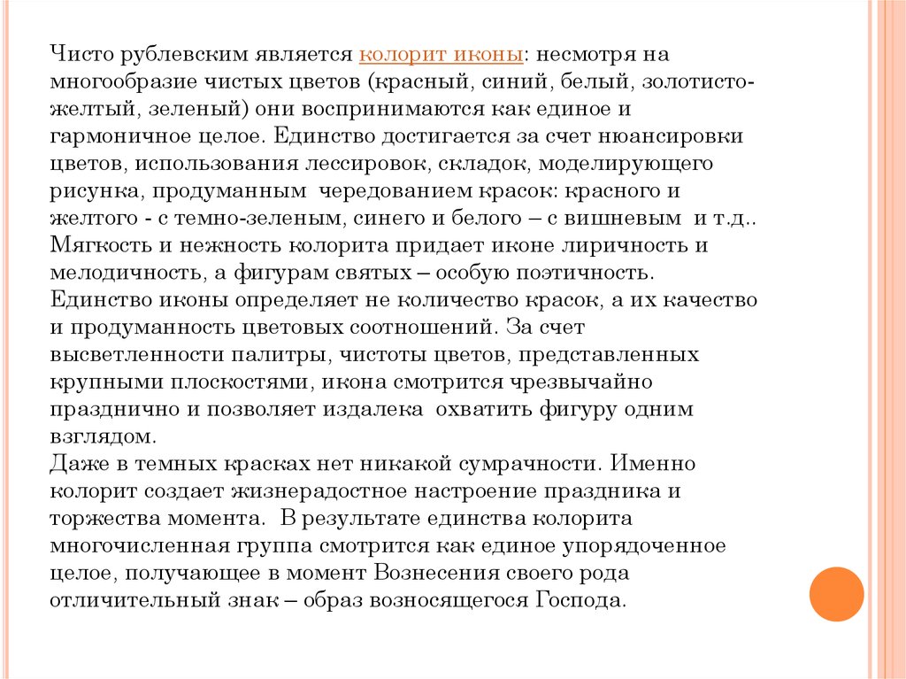 Чисто рублевским является колорит иконы: несмотря намногообразие чистых цветов (красный, синий, белый, золотистожелтый, зеленый) они воспринимаются как единое и