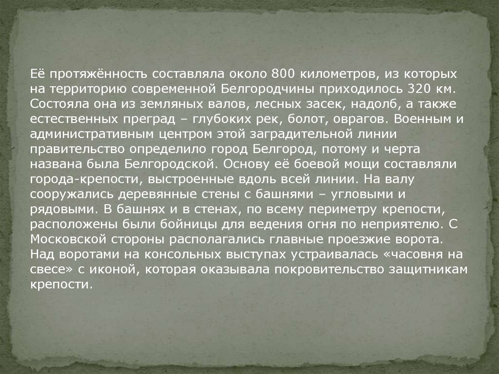 Её протяжённость составляла около 800 километров, из которыхна территорию современной Белгородчины приходилось 320 км.