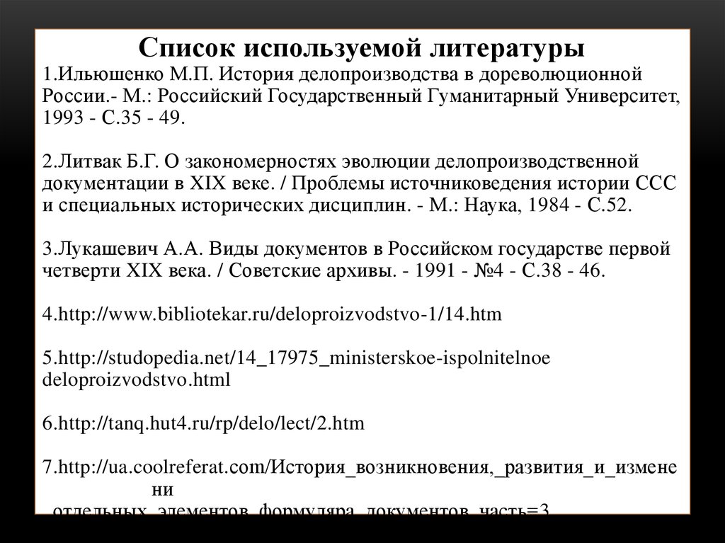 Список используемой литературы1.Ильюшенко М.П. История делопроизводства в дореволюционной