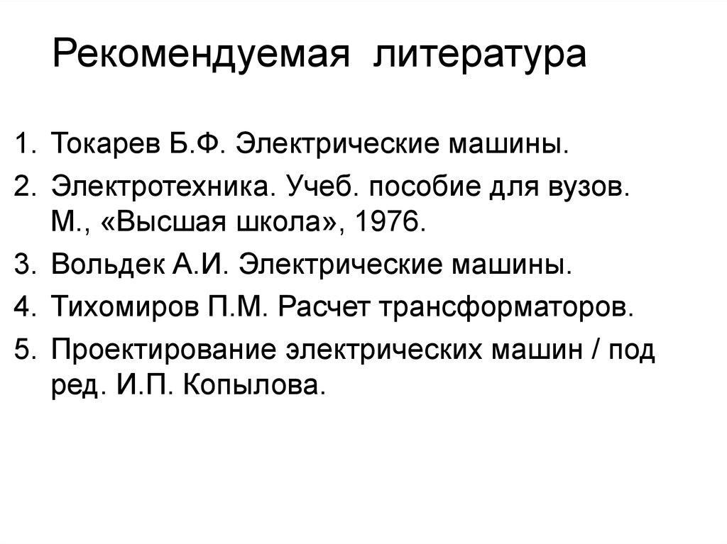 Рекомендуемая литература1. Токарев Б.Ф. Электрические машины.
