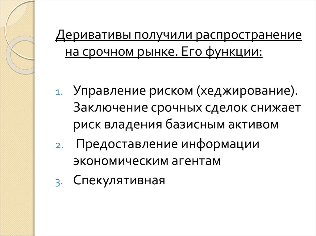 Деривативы получили распространениена срочном рынке. Его функции: