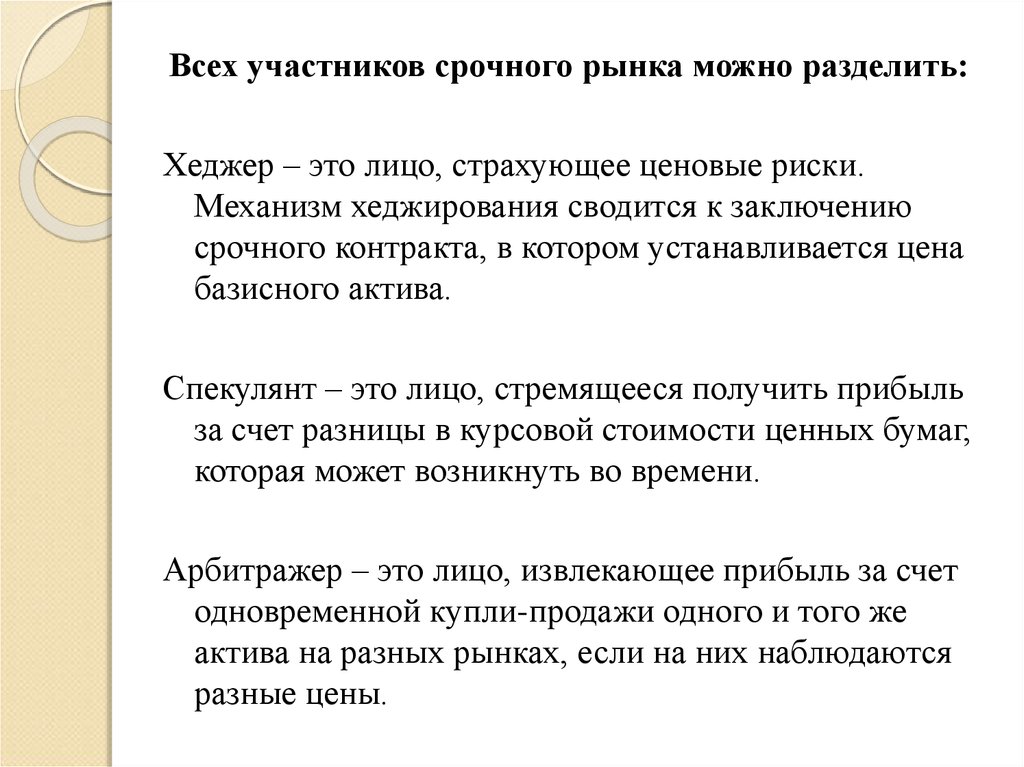 Всех участников срочного рынка можно разделить:Хеджер – это лицо, страхующее ценовые риски.