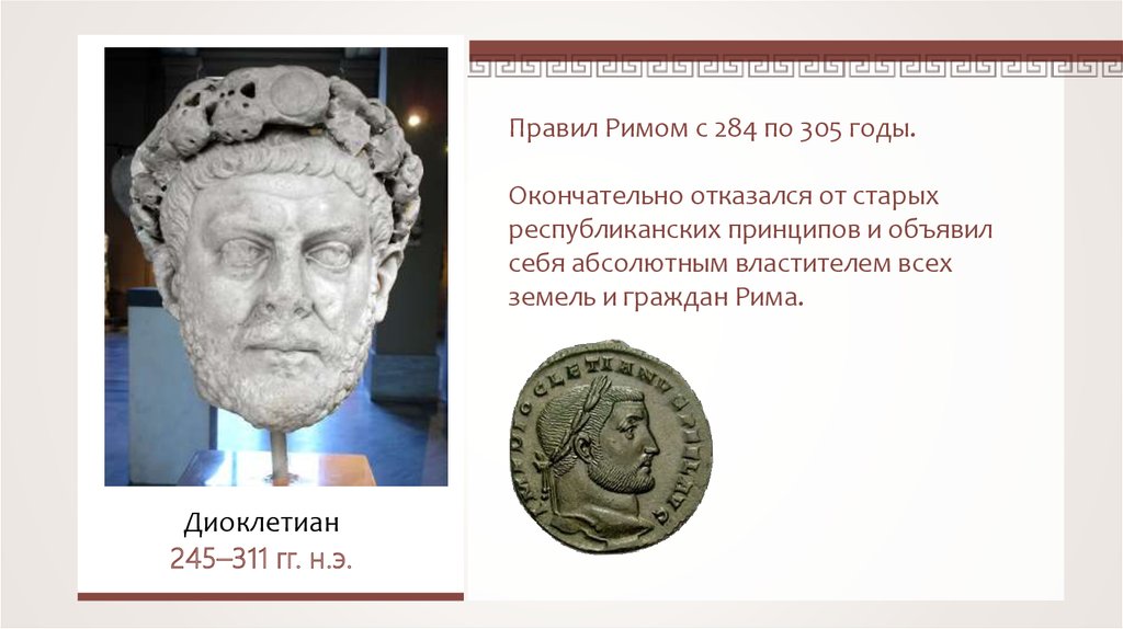 Правил Римом с 284 по 305 годы.Окончательно отказался от старых