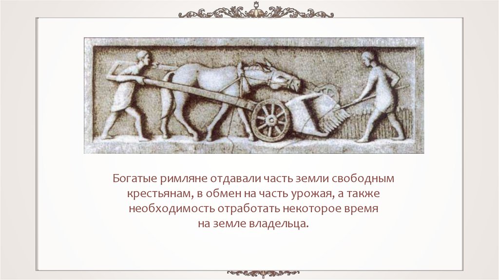 Богатые римляне отдавали часть земли свободнымкрестьянам, в обмен на часть урожая, а также