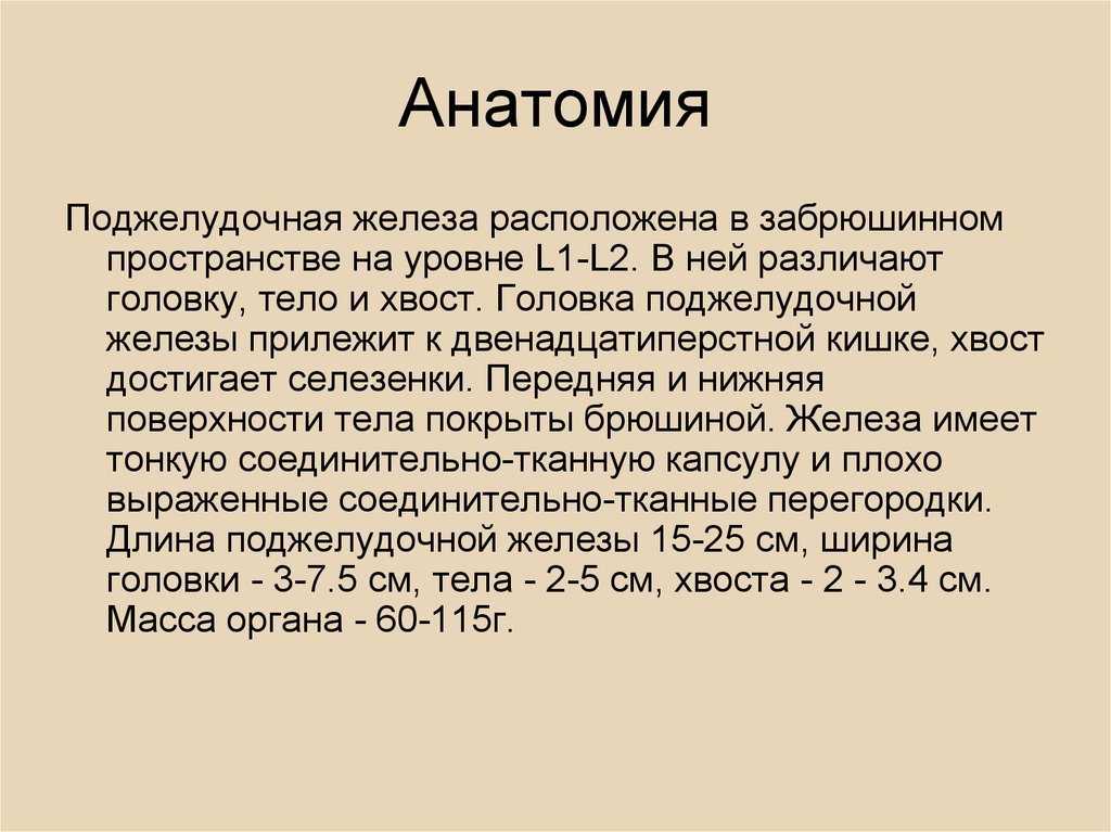 Поджелудочная железа расположена в забрюшинномпространстве на уровне L1-L2. В ней различают