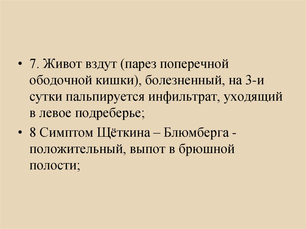 • 8 Симптом Щёткина – Блюмберга положительный, выпот в брюшной