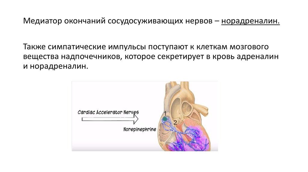 Медиатор окончаний сосудосуживающих нервов – норадреналин.Также симпатические импульсы поступают к клеткам мозгового